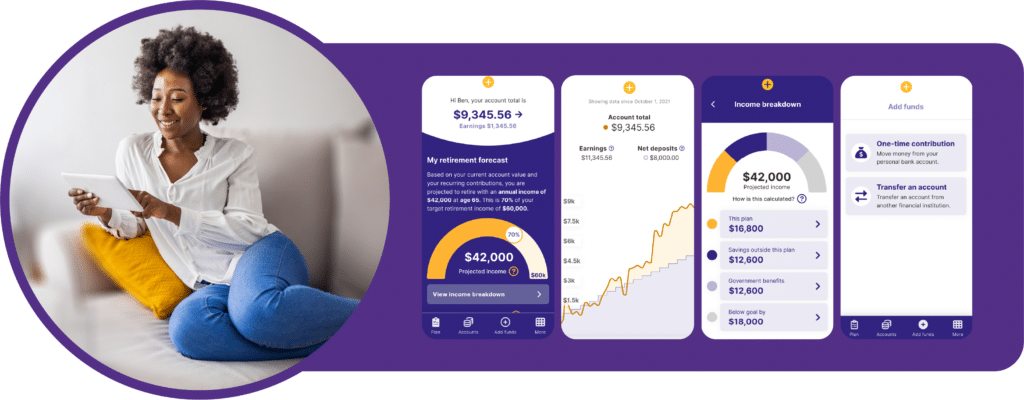 Notre design frais et intuitif facilite la surveillance de votre plan de retraite de n’importe où. Renseignez-vous sur les détails de votre régime, y compris votre solde, combien vous avez gagné grâce à vos investissements et comment vous progressez vers votre objectif de revenu de retraite.